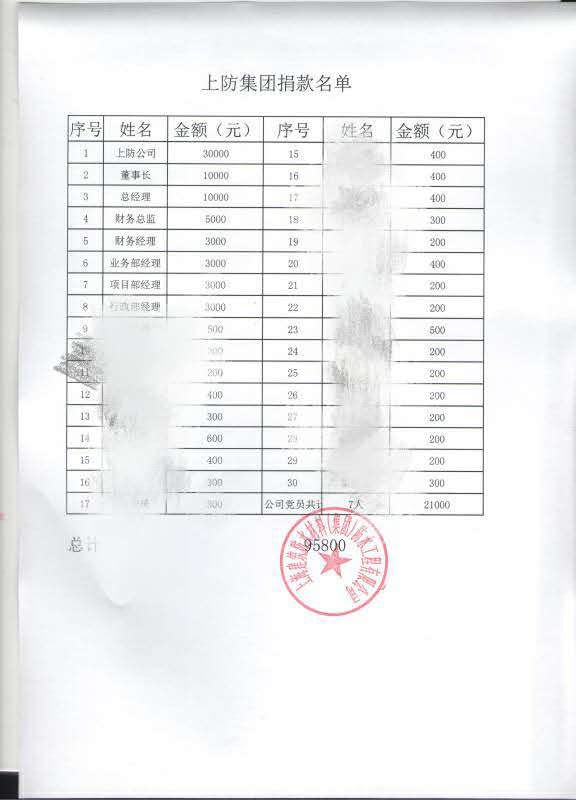 该同志在上防集团工作以来,一直勤勤恳恳、兢兢业业,深得同事及领导的认可,现得知其家庭的不幸,在此,公司全体领导及同仁自发捐款,向其家庭伸出援助之手,本次上防集团全体领导、同仁及优秀党员同志共计捐款 95800 元,尽管这些爱心远远达不到医院的高消费额度,但却足以表达上防集团“一方有难、八方支援”的优秀的企业精神及员工之间互帮互助、团结一致的工作氛围,让所有员工都能充分感受到上防集团就是一个温暖的大家庭。