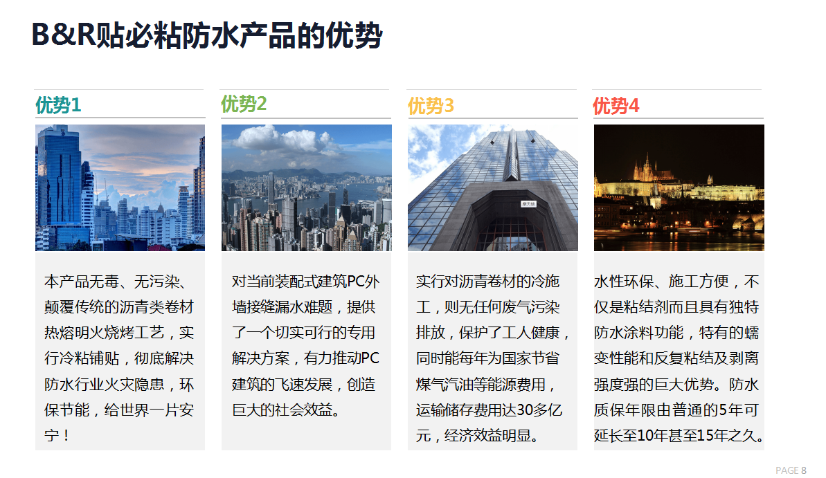 对当前装配式建筑PC外墙接缝漏水难题,提供了一个切实可行的专用解决方案,有力推动PC建筑的飞速发展,创造巨大的社会效益,而且此产品水性环保、施工方便,不仅是粘结剂而且具有独特防水涂料功能,特有的蠕变性能和反复粘结及剥离强度强的巨大优势,防水质保年限由普通的5年可延长至10年甚至15年之久。