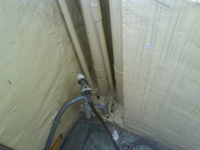 外墙│墙壁防水抓漏工程 ~~上图中這么多管路的下方是漏水处,它的漏水源大致应该是在這里沒有錯, 水是从哪里渗漏说真的沒有一個人可以确实地告訴你, 在施工上我們要以全面性防水施作的心态, 可以防止水无孔不入的特性.