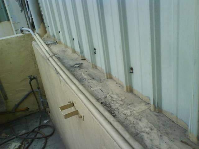 外墙│墙壁防水工程 ~~为什么要在這边施作防水?因为铁皮屋搭在共用墙壁延伸下來的是一個露台, 它的漏水原因不是铁皮屋和水泥墙的搭接缝漏水, 而是铁皮屋上方迎水面的水泥粉刷(粗胚层)容易吸水所造成的向下渗漏.