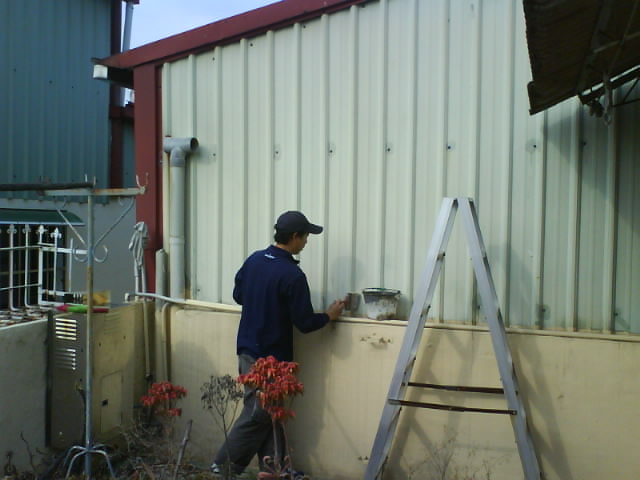 外墙│墙壁防水工程 ~~有全面性防水的心态才不會造成抓這裡漏那里的情況. 將可能造成漏水的必須施工处整理清洁, 此工程是采用外墙瓷砖面专用的透明防水材, 施作全面性包覆, 铁皮屋烤漆浪板搭接处,還有钉头补上填缝材(速利康).