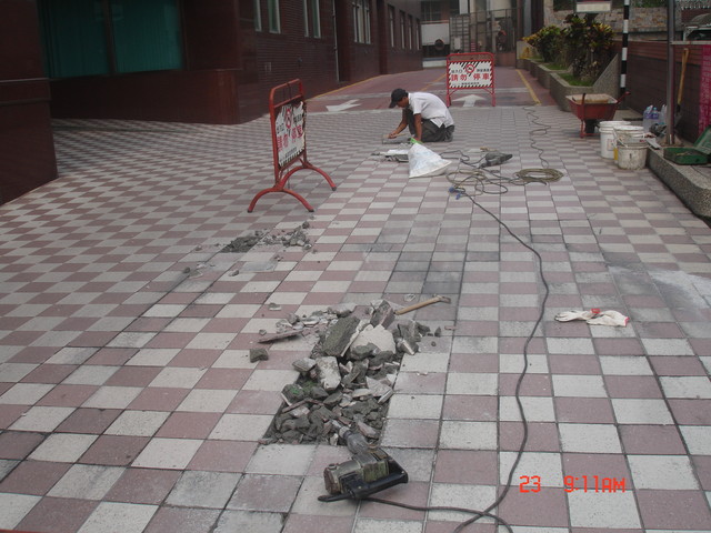 房屋整修 | 房屋大小修缮:車道地砖补修工程 , 車道入口处,因有大型車在压,容易造成受损,此車道下方为地下室,造成地砖损坏的原因为:地下室上层、楼板施作PU防水层,导致內软外硬的情況,经长期的轮压造成振动而损坏.