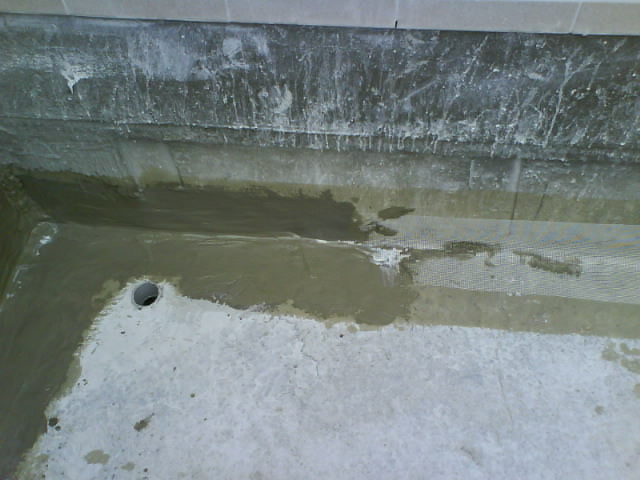 屋頂防水工程 L角铺设加強网以往屋頂漏水的部位,大部份都發生在這個L 角和漏水管旁边,因為L角的女儿墙和地坪不是一体成型有二次的施工接缝,本工法采用海菜水泥膏,在二次接缝部分加強防水層的抗拉性